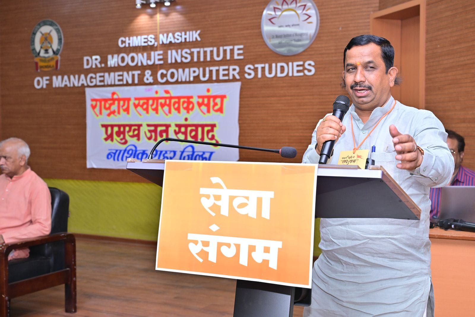 नाशिक - संघ शताब्दी वर्षानिमित्त रा.स्व.संघ नाशिक शहर जिल्हा सेवा विभागाच्या वतीने प्रमुख जनसंवाद सेवा संगम या कार्यक्रमाचे आयोजन डॉ.मुंजे इन्स्टिट्यूट भोसला कॉलेज येथे करण्यात आले होते. नाशिक शहरातील पर्यावरण, आरोग्य, शैक्षणिक, सामाजिक, सांस्कृतिक अश्या विविध सेवा क्षेत्रात काम करणाऱ्या १४० सामाजिक संस्थांनी यात सहभाग नोंदवला. सेवा संगम या कार्यक्रमास प्रमुख वक्ते रा.स्व.संघ पश्चिम महाराष्ट्र प्रांत सहकार्यवाह महेश कर्पे यांनी मार्गदर्शन केले. कार्यक्रमास रा.स्व.संघ नाशिक विभाग सहकार्यवाह राजेश राव, रा.स्व.संघ नाशिक शहर जिल्हा मा. संघचालक डॉ. विजयराव मालपाठक, जिल्हा कार्यवाह सुहास वैद्य, सह कार्यवाह रोहित गायधनी, रा.स्व.संघ नाशिक शहरजिल्हा सेवा विभाग प्रमुख अनिल पाटील, सह प्रमुख योगेश गर्गे उपस्थित होते.