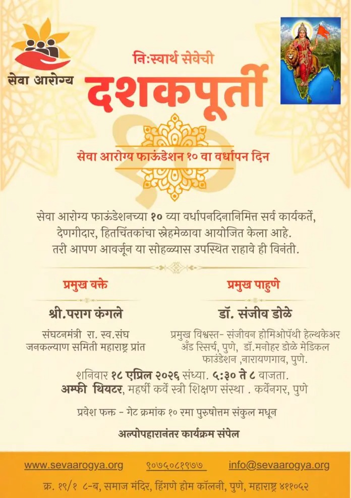 समाजातील वंचित आणि तळागाळातील घटकांना त्यांच्याच वस्तीत माफक दरात दर्जेदार आरोग्यसेवा उपलब्ध करून देणाऱ्या ‘सेवा आरोग्य फाउंडेशन’च्या निःस्वार्थ कार्याला यंदा दहा वर्षे पूर्ण होत आहेत. या उल्लेखनीय प्रवासाच्या ‘दशकपूर्ती’ निमित्त संस्थेचा दहावा वर्धापन दिन आणि स्नेहमेळावा शनिवार,१८ एप्रिल २०२६ रोजी कर्वेनगर येथे आयोजित करण्यात आला आहे.