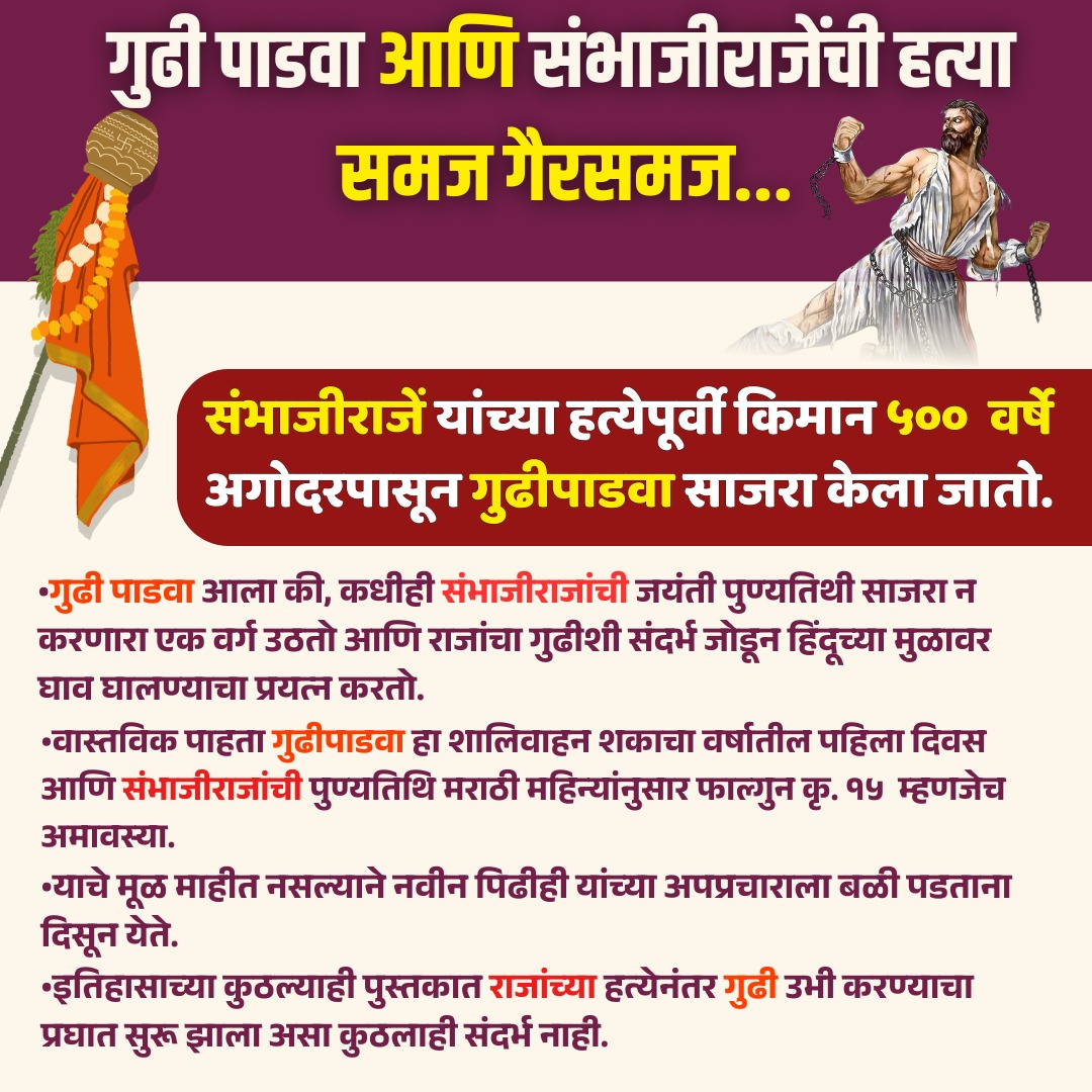 गुढी पाडवा आला की, कधीही संभाजीराजांची जयंती पुण्यतिथी साजरा न करणारा एक वर्ग उठतो आणि राजांचा गुढीशी संदर्भ जोडून हिंदूच्या मुळावर घाव घालण्याचा प्रयत्न करतो. वास्तविक पाहता गुढीपाडवा हा शालिवाहन शकाचा वर्षातील पहिला दिवस आणि संभाजीराजांची पुण्यतिथि 11 मार्च मराठी महिन्यांनुसार फाल्गुन कृ. 15 म्हणजेच आमवस्या. याचे मूळ माहीत नसल्याने नवीन पिढीही यांच्या अपप्रचाराला बळी पडताना दिसून येते. इतिहासाच्या कुठल्याही पुस्तकात राजांच्या हत्येनंतर गुढी उभी करण्याचा प्रघात सुरू झाला असा कुठलाही संदर्भ नाही. यासाठी खुले आवाहन दिलेतरी ते वावगे ठरणार नाही. संभाजीराजेंच्या हत्तेपुर्वी किमान 500 वर्षे अगोदरपासून गुढीपाडवा साजरा केला जातो.